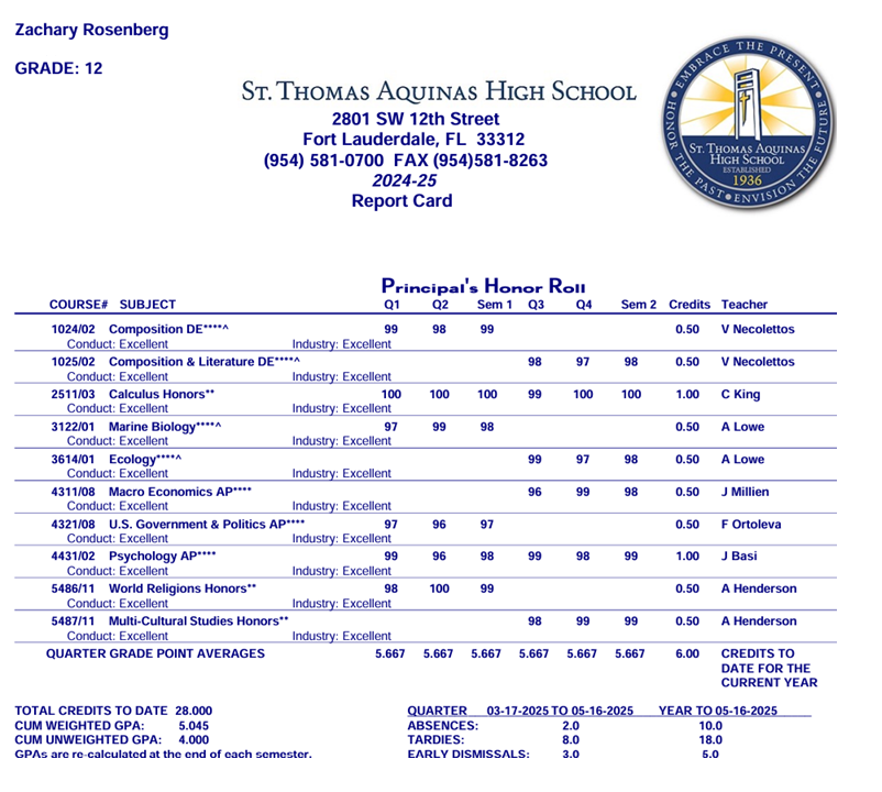 - Broward County FL Scholar Athlete Award 2025 (1 of 7 selected from St. Thomas HS)